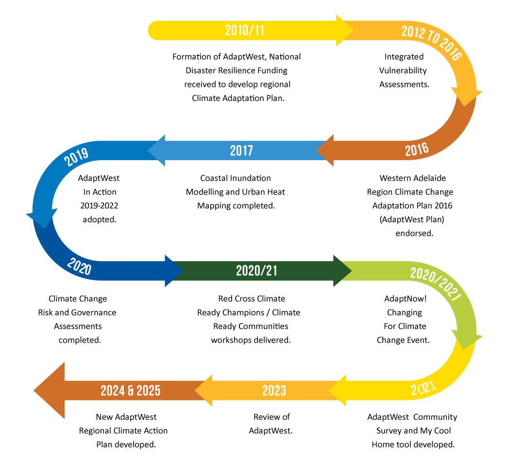 The AdaptWest Climate Change Adaptation Plan, developed collaboratively by the cities of Charles Sturt, Port Adelaide-Enfield and West Torrens comprising the Western Adelaide Planning Region, identifies the real and specific implications of climate change; and provides realistic strategies for residents, businesses, organisations and agencies of our western community to get ready, to respond and build resilience to the present and future challenges of climate change.